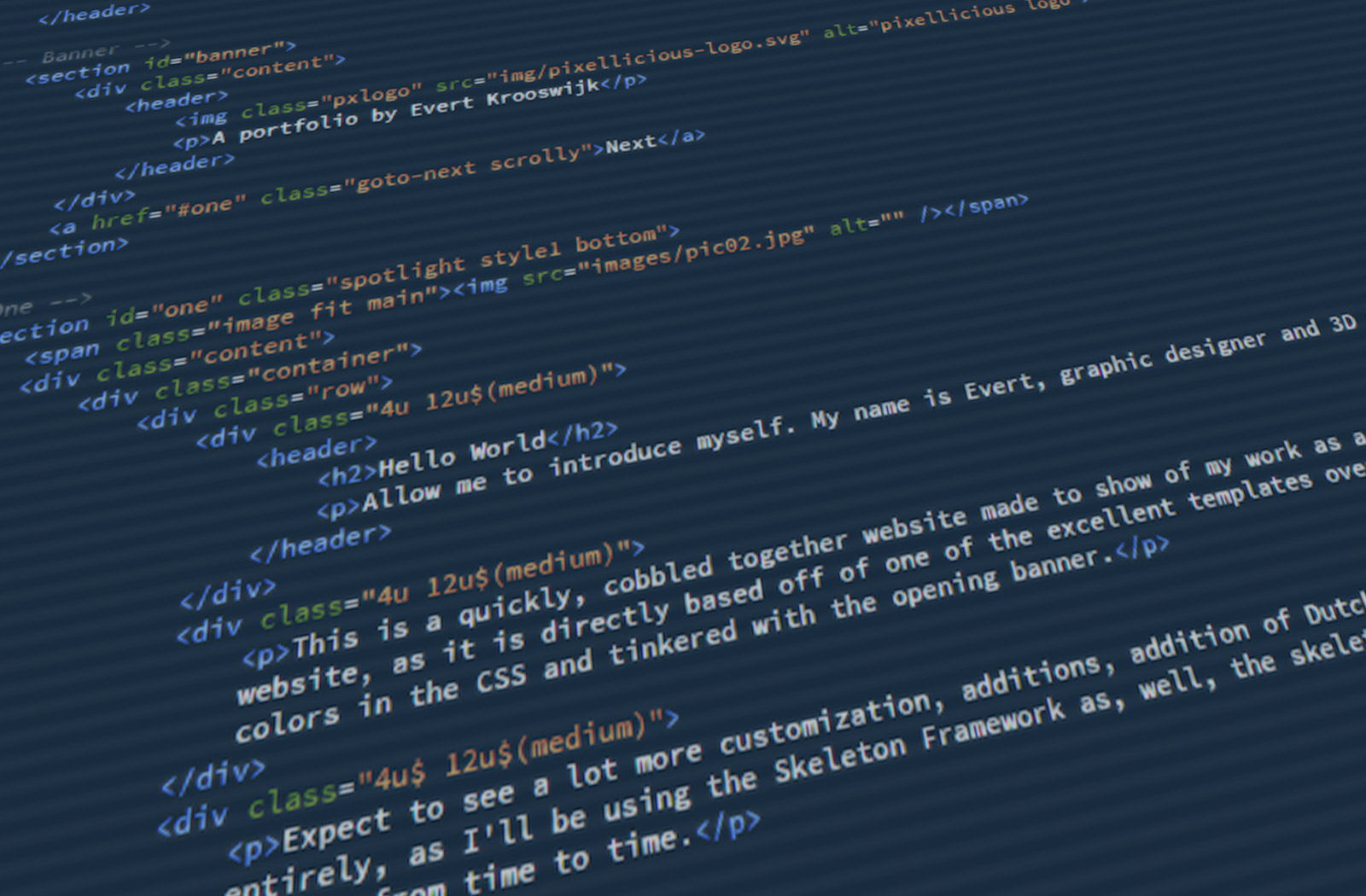 This is a quickly, cobbled together website made to show of my work as a graphic designer and 3D illustrator. As of yet I can't take credit for this website, as it is directly based off of one of the excellent templates over at HTML5 UP. I merely some changed up the colors in the CSS and tinkered with the opening banner.