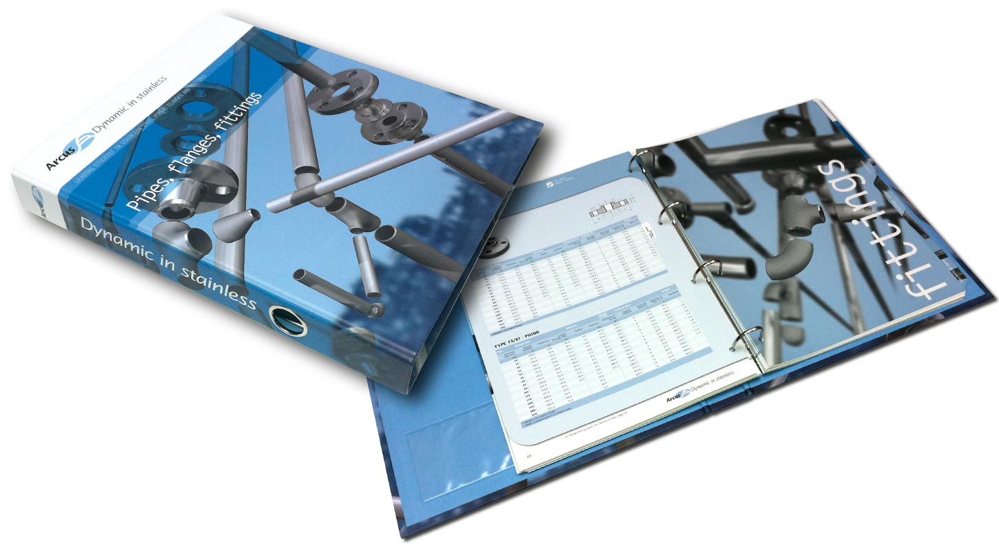 Technical documentation for Arcus, stainless steel pipes, flanges and fittings.Software: Adobe InDesign, Illustrator, Photoshop, Autodesk Maya
