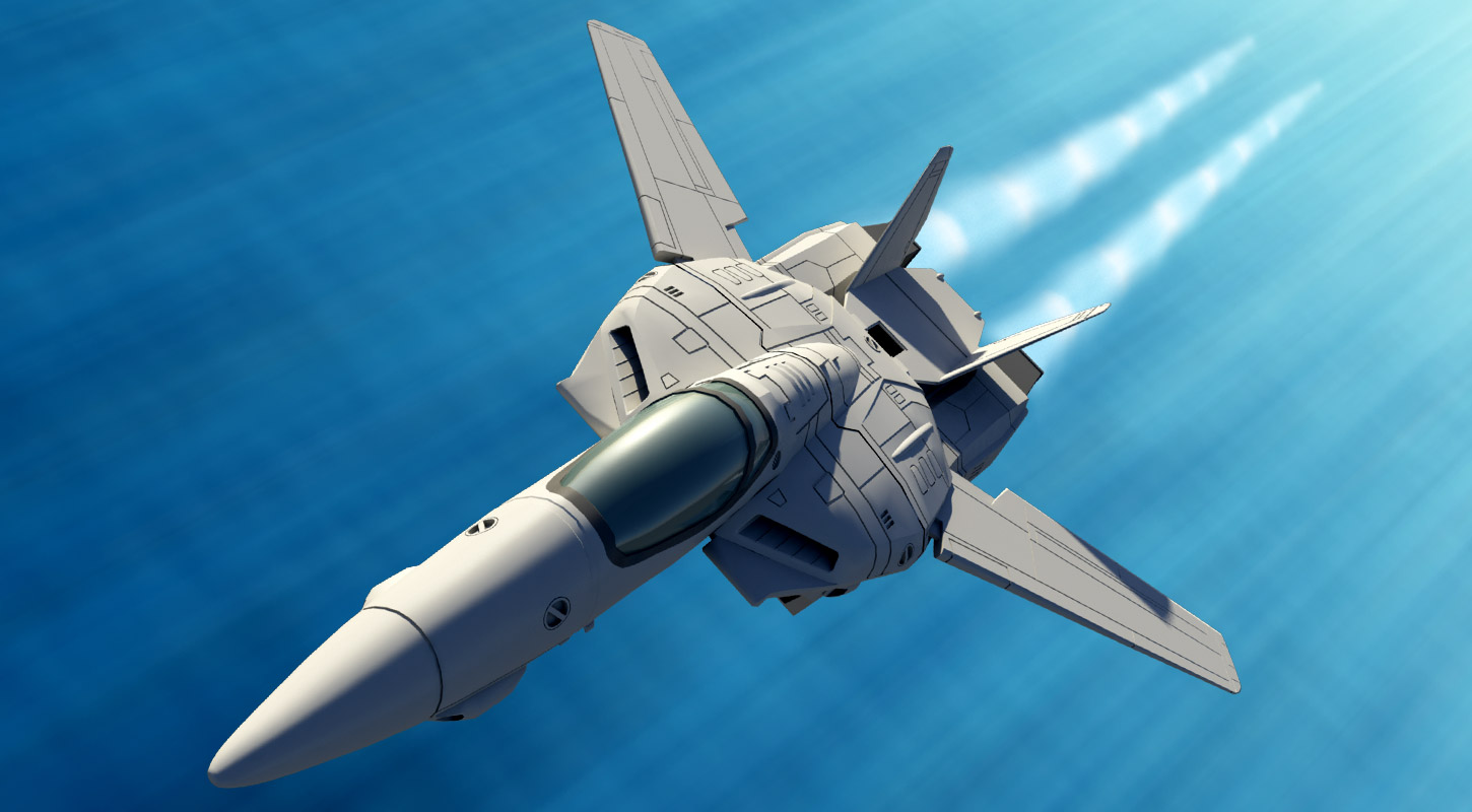 Fictional 'variable fighter' from the Macross anime series.Software: Autodesk Maya, Adobe Photoshop
